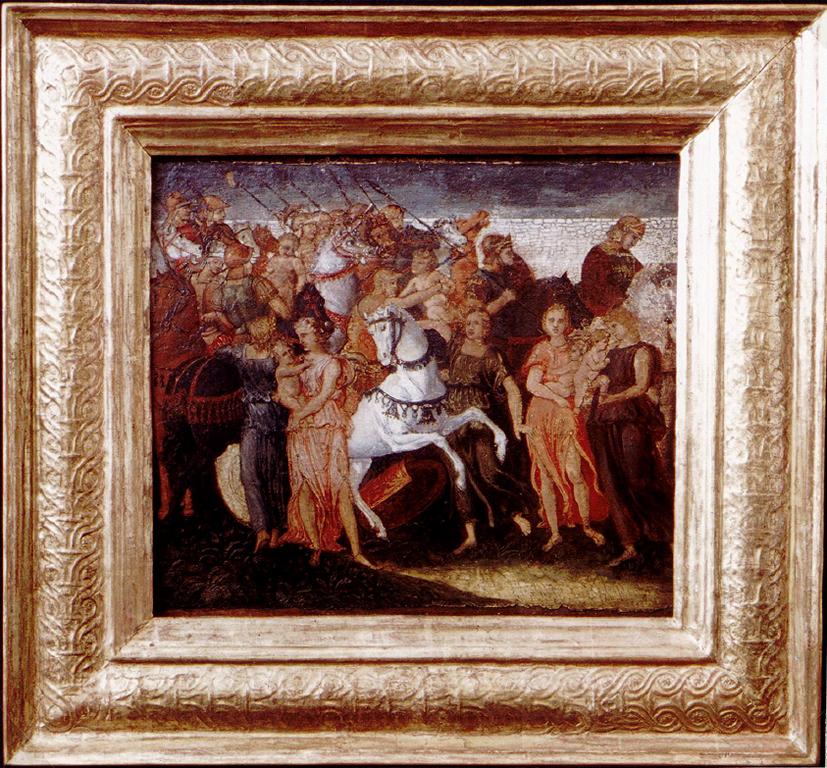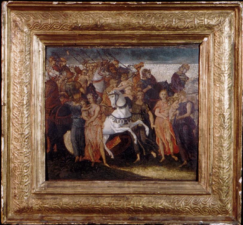 Holztafelgemälde (Fragment aus einer italienischen Hochzeitstruhe, italienisch: Cassone) in einem vergoldeten Schmuckrahmen (Venezianischer Pastiglia-Rahmen mit Flechtband-Ornamentik)