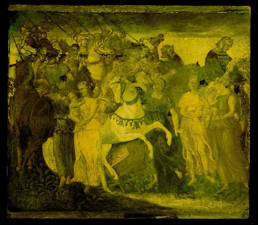 UV-Fluoreszensaufnahme des Gemäldes. Der nachträgliche grün-gelb fluoreszierende Firnis reicht bis über die holzsichtigen Tafelränder oben und unten. Retuschen aus jüngerer Zeit markieren sich dunkel. Frühere umfangreiche Überarbeitungen sind hier schwer zu erkennen.
