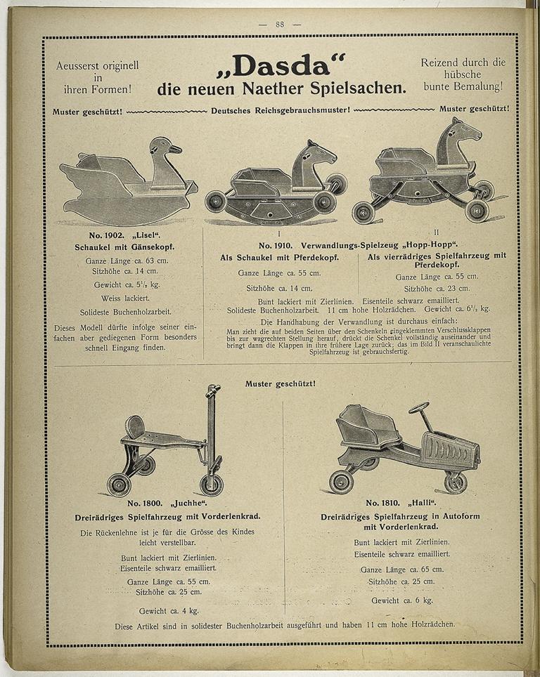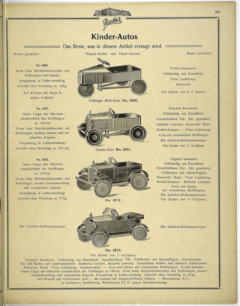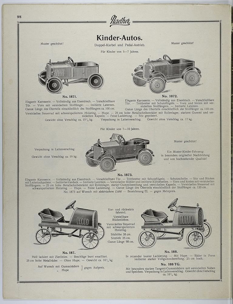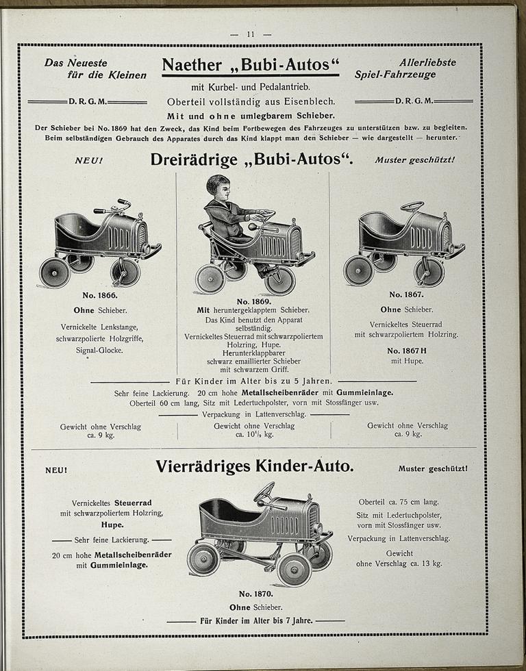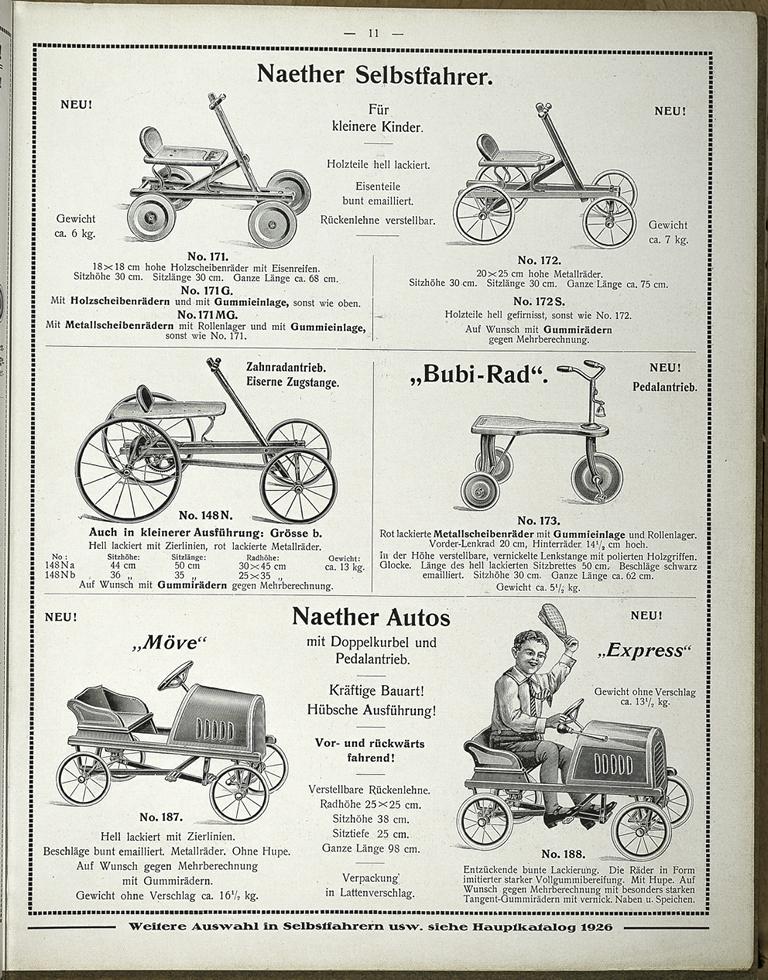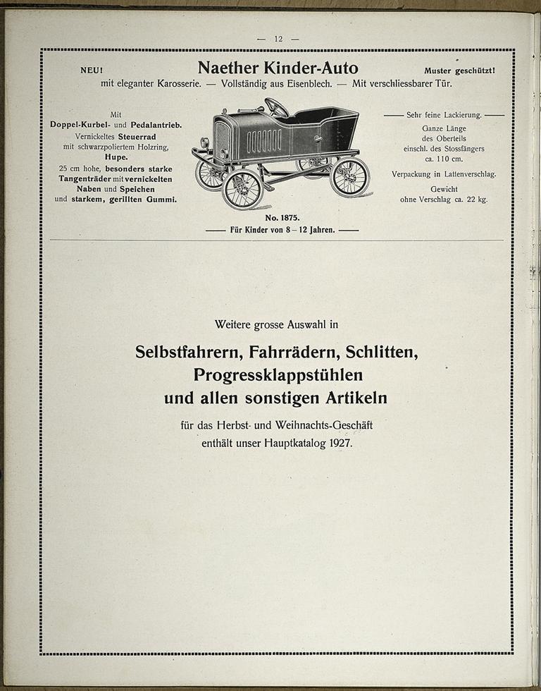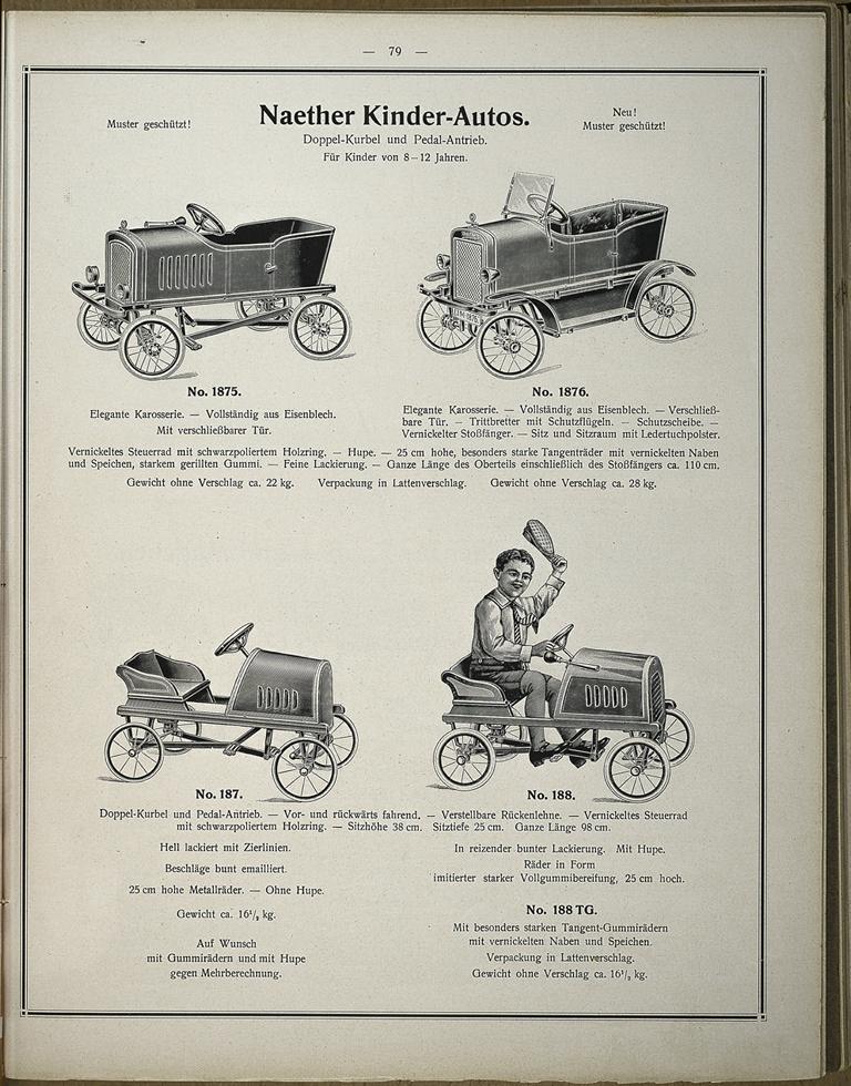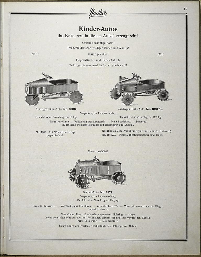 Bis 1934 hat Naether eine große Auswahl an Kinderautos im Angebot; ab 1935 fehlen sie dann plötzlich im Angebot der Firma.